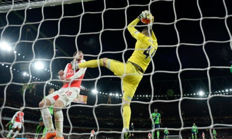 Southampton came to the Emirates having not conceded a goal in 200 minutes of league football, and they looked intent on keeping it that way with Oriol Romeu and Victor Wanyama a muscular double bolt in midfield. Arsenal went wide, Héctor Bellerín skating outside Cédric Soares and producing a fine cross that Olivier Giroud headed back across goal. Özil flicked towards an apparently gaping net from five yards out only to see Forster, spreading his arms, produce a genuinely stunning save. With half-time approaching Özil was again crowded out inside the six-yard box after good work from Joel Campbell. But it was Southampton, composed in defence and intermittently energetic in support of Shane Long, who looked the happier team at the break.