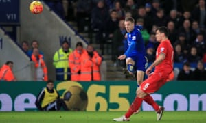 Leicester’s Jamie Vardy opens the scoring with a stunning strike against Liverpool, in their Premier League game at the King Power Stadium.